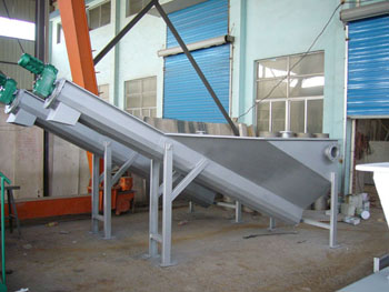 砂水混合物從頂部的法蘭接管進入儲液箱內。箱內設計的散水盤使水匯集于下水槽。砂水混合夜中,砂石逐漸沉淀于下部的螺旋u形槽內。空心帶式螺旋緩慢旋轉砂礫推向上出口,自然脫水排除。