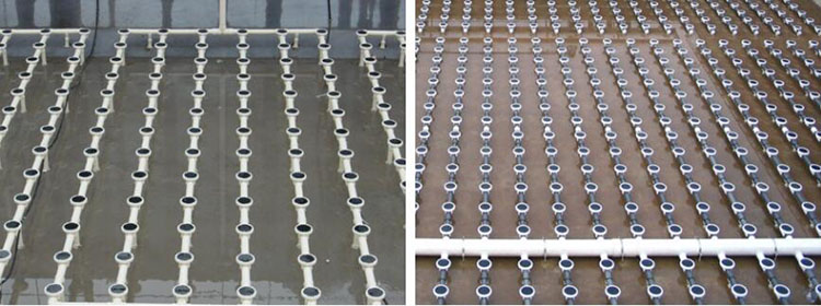 通過(guò)多年工程應(yīng)用經(jīng)驗(yàn),微孔曝氣器存在膜片撕裂、膜片打不開(kāi)、污泥進(jìn)入支氣管等問(wèn)題。通過(guò)拆解曝氣器分析,造成上述原因大部分是由于停止曝氣后,污水通過(guò)曝氣器進(jìn)入管道,待下次重啟系統(tǒng),由于風(fēng)管流速一般設(shè)計(jì)空氣流速約10倍液體流速,管道內(nèi)的液體容易沖破膜片。污水進(jìn)入曝氣器內(nèi)部亦會(huì)造成曝氣器內(nèi)部污染。