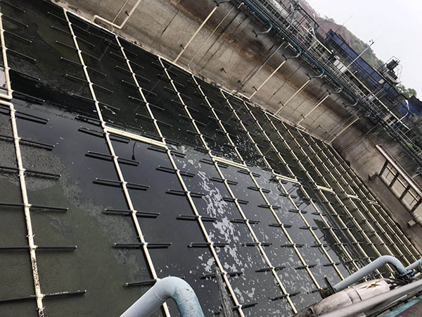 該曝氣器由四根纜繩懸掛于水中,其中空氣通過兩根Φ32的導氣管進入曝氣器,氣流通過引導分流,由膜管處滲出,產生微型氣泡。框架內使 用圓鋼承重以保證曝氣器在工作時平穩的沉在水底而不漂浮起來。